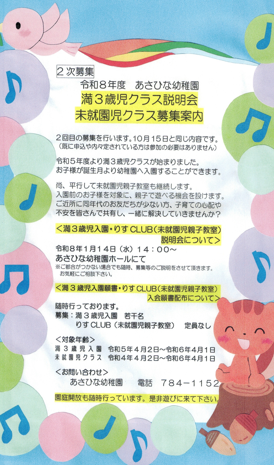 2次募集 令和8年度満3歳児入園・りすCLUB説明会について